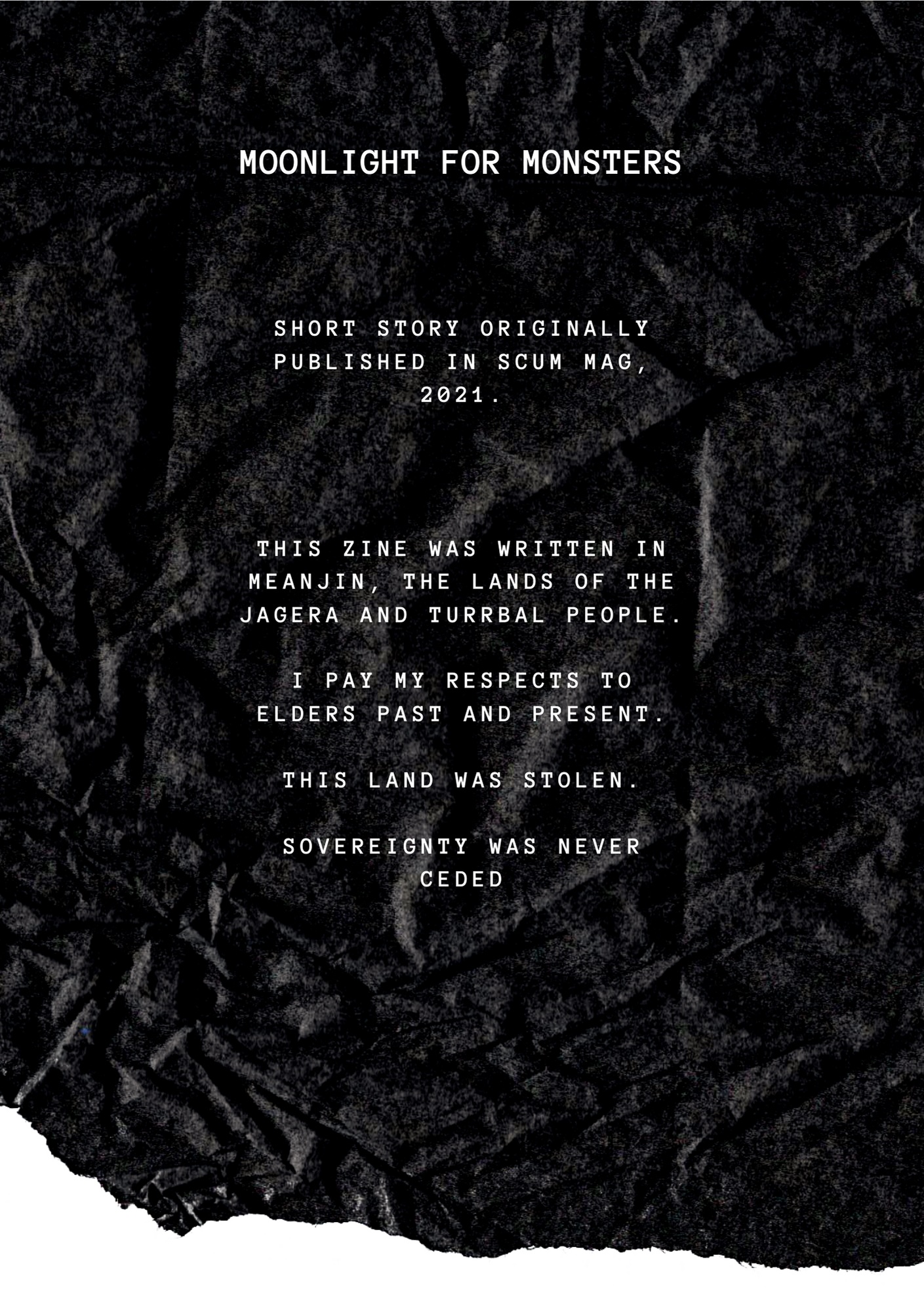 ('Moonlight for Monsters' was made for the Hallowzeen zine swap for Sticky Institute, 2021. The short story was originally published in Scum Mag, 2021.)